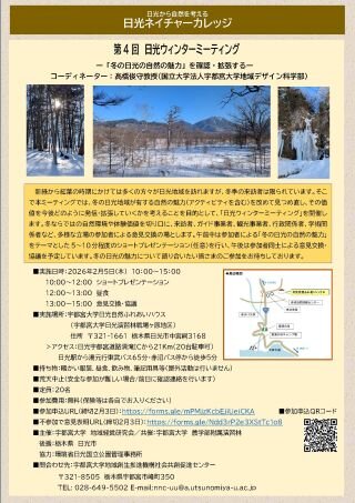 午前は希望者による「冬の日光の自然の魅力」をテーマとした5~10分程度のショートプレゼンテーション、午後は参加者同士による意見交換・協議を予定しています。冬の日光の魅力について、語り合いたい皆さまのご参加をお待ちしております。